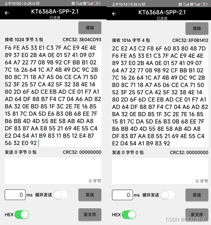 3、这里还有一个细节,蓝牙不是实时发送的,而是等待心跳包确认之后才发送,大概是10ms左右交互一次,如果当前收满256之后,还没到发送的时间,此时还会继续串口接收存到缓存,等时间到了,在一起发送到spp,所以长度是不确定的