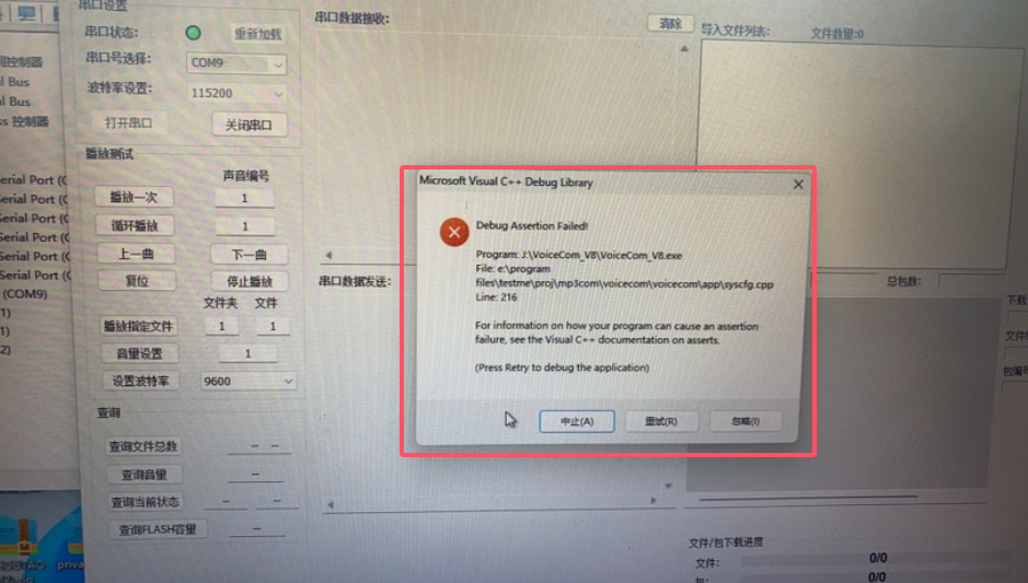 文档聚焦 KT148A 语音芯片串口下载工具报错问题,用户在 Win11 等系统使用时弹出 Microsoft Visual C++ Debug Library 错误。公司电脑使用各系统均正常,工具非批量生产用。排错需确认 Cfg.xml 与 VoiceCom_V8.exe 同路径,不在桌面等可能无权访问的系统盘运行。若无效,建议换电脑。