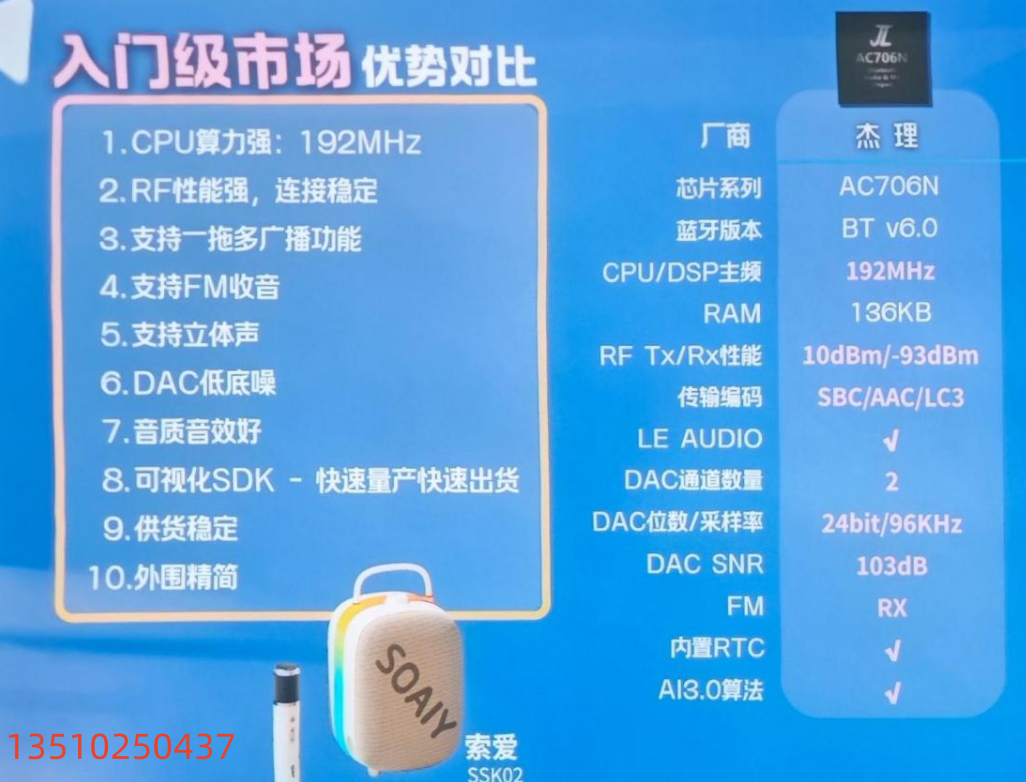 优势:CPU 算力 192MHz ;RF 性能强、连接稳;支持一拖多广播、FM 收音、立体声;DAC 低底噪,音质音效好;可视化 SDK 助快速量产出货,供货稳、外围精简 。