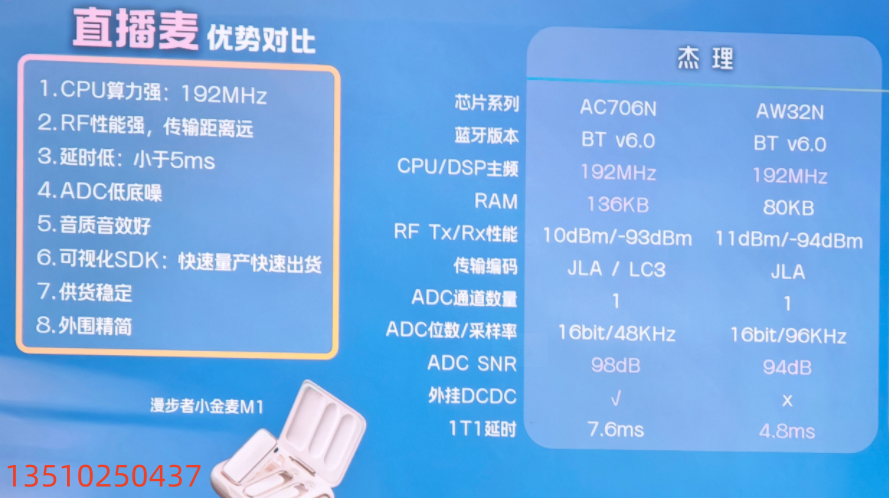 - AC706N :蓝牙 v6.0 ;RAM 136KB ;RF Tx/Rx 性能 10dBm/-93dBm ;传输编码 JLA / LC3 ;ADC 通道 1 、16bit/48KHz 、SNR 98dB ;外挂 DCDC 支持 ;1T1 延时 7.6ms 。