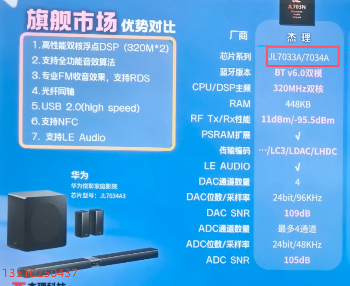 - 优势:高性能双核浮点 DSP(320M*2 );支持全功能音效算法;专业 FM 收音(支持 RDS );光纤同轴;USB 2.0 (high speed) ;支持 NFC 、LE Audio 。