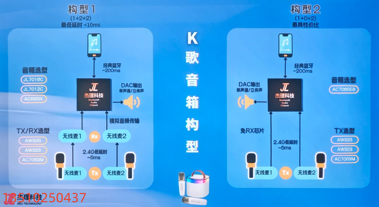 流程:手机(经典蓝牙~200ms )→杰理科技蓝牙芯片→DAC 输出单声道 / 立体声→音箱;无线麦 1(Tx )、无线麦 2(Tx )→2.4G 低延时(~5ms )传输→杰理科技蓝牙芯片(Rx )→模拟音频传输→音箱
