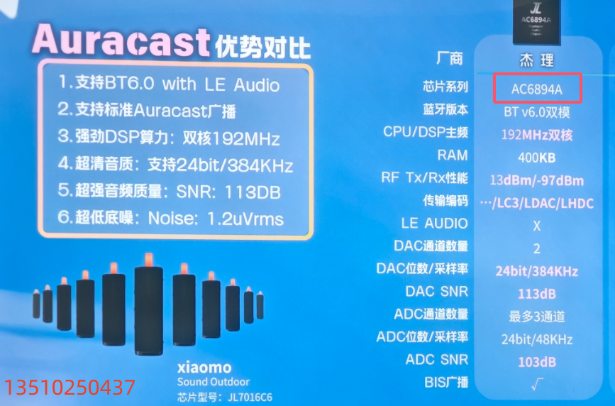 - 优势:支持 BT6.0 with LE Audio 、标准 Auracast 广播;双核 192MHz DSP 算力;24bit/384KHz 超清音质;SNR 113dB 超强音频质量;1.2uVrms 超低底噪 。