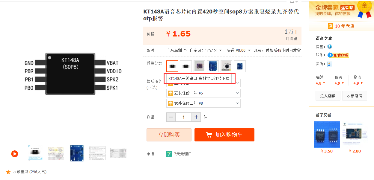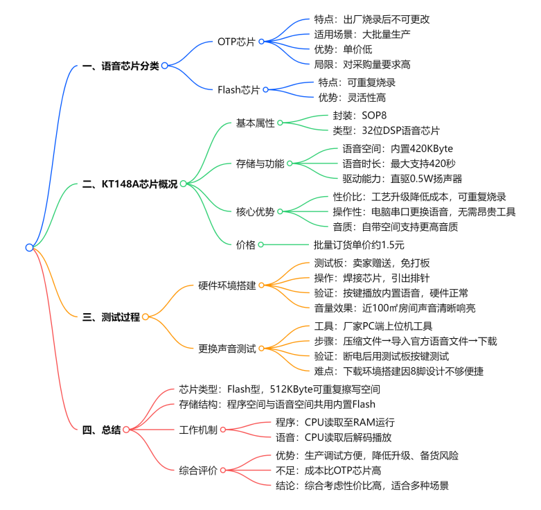 文档主要介绍国产可重复擦写语音芯片 KT148A。其为 32 位 DSP 语音芯片,采用 SOP8 封装,内置 420KByte 语音空间,支持 420 秒语音存储和多段语音播放,可直驱 0.5W 扬声器。用户通过电脑串口就能更换语音,无需昂贵工具,批量订货单价约 1.5 元,性价比高。测试时,卖家赠送测试底板,焊接后用按键可播放内置语音,音量在近 100 平方房间清晰响亮。更换声音时用厂家上位机工具,压缩并导入文件下载即可,虽下载环境搭建因 8 脚设计不便,但操作较易。KT148A 属 Flash 型,程序和语音空间共用内置 Flash,可重复擦写让生产调试更方便,虽成本高于 OTP 芯片,但综合升级、备货等因素,性价比值得肯定。