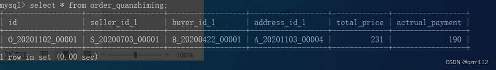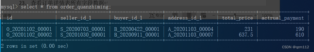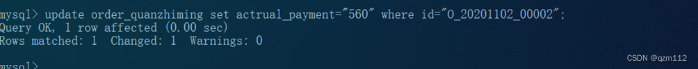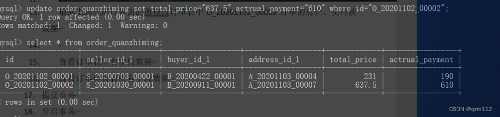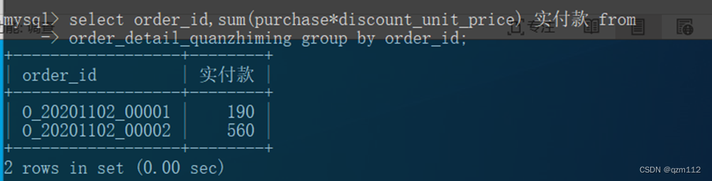 - 根据上述代码计算出的值修改订单表中O_20201102_00002订单的实付款数据