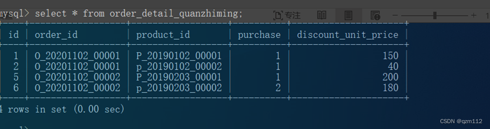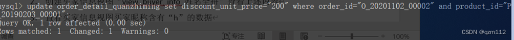 - 修改订单详情表中O_20201102_00002订单P_20190203_00001产品的折后单价为200
