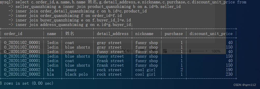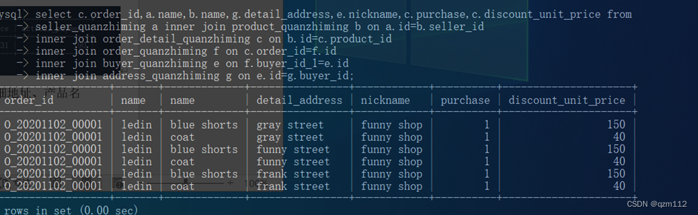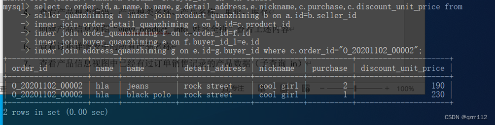 - 查看O_20201102_00002订单的订单编号、店铺名称、买家昵称、详细地址、产品名称、采购数量、折后价格