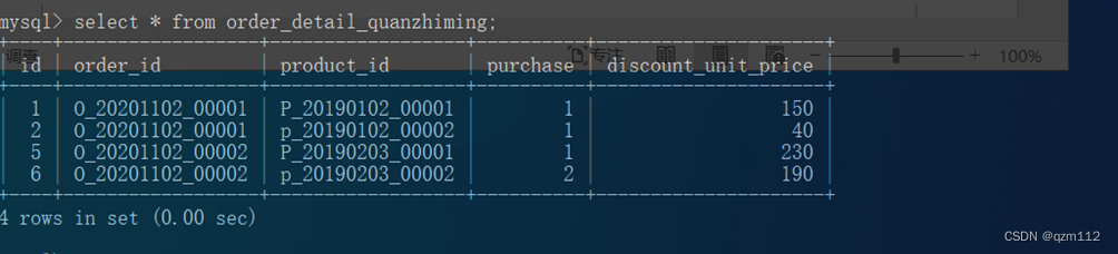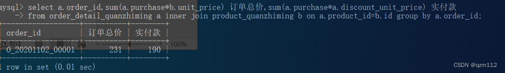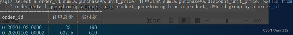 - 根据订单号分组查看订单总价(sum(采购数量*产品单价))、实付款(sum(采购数量*折扣单价))