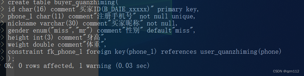 - 创建买家信息表“buyer_姓名全拼”,表中字段信息如下: