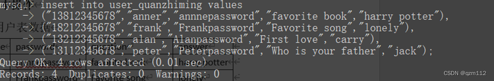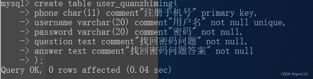 - 创建用户表“user_姓名全拼”,表中字段信息如下: