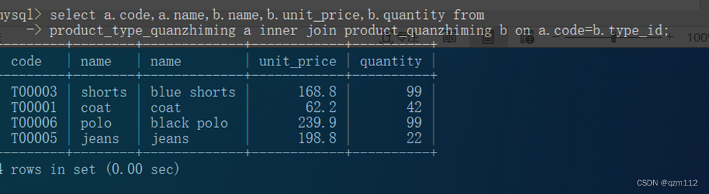 - 查看产品种类编码、产品种类名称、产品名称、单价、库存