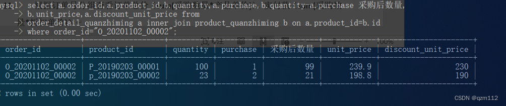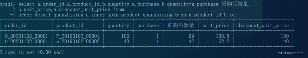 - 查看O_20201102_00001订单的订单编号、产品编号、库存数量、采购数量、采购后数量(库存数量-采购数量)、产品单价、折后单价