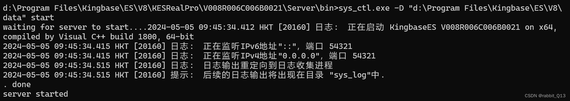 waiting for server to start....2024-05-05 09:45:34.412 HKT [20160] 日志: 正在启动 KingbaseES V008R006C006B0021 on x64, compiled by Visual C++ build 1800, 64-bit