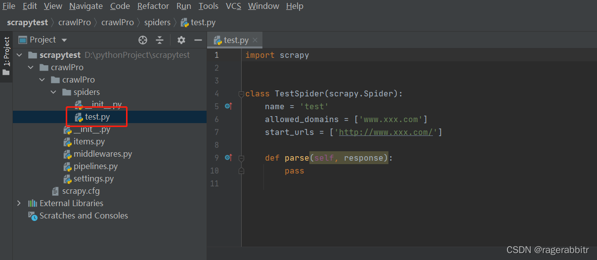 这个时候,在spiders文件夹下,会多一个test.py的文件,这样源文件就建立好了,整个项目建立完毕。