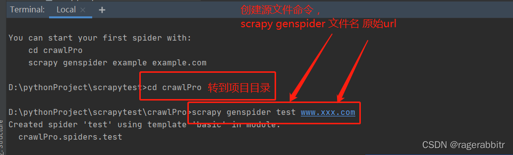 scrapy genspider test www.xxx.com #最后两项为文件名和原始url,原始url后期进入程序后可以修改