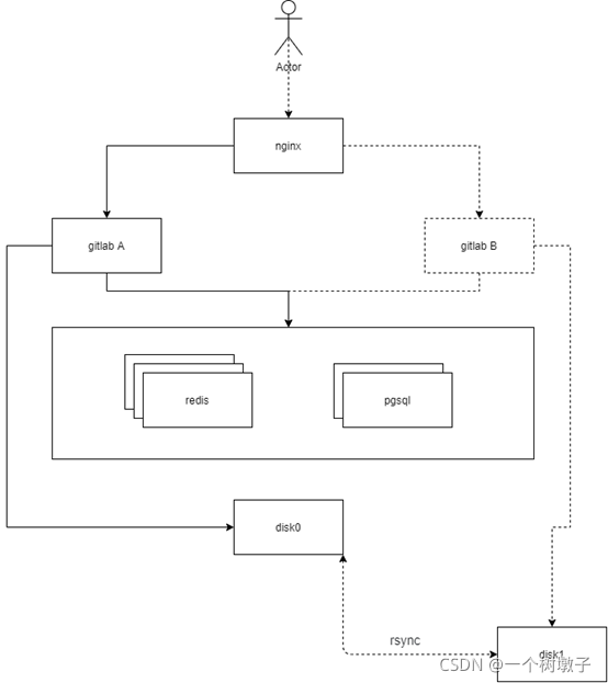git 本是个分布式源码管理 。所以本方案期望不增加过高复杂度和硬件成本的前提,保证gitlab主体具备高可用,同时由于源码重要性和实时性需要具备数据一致性,而且为避免硬件问题导致数据丢失,采用rsync+定时冷备的方案。