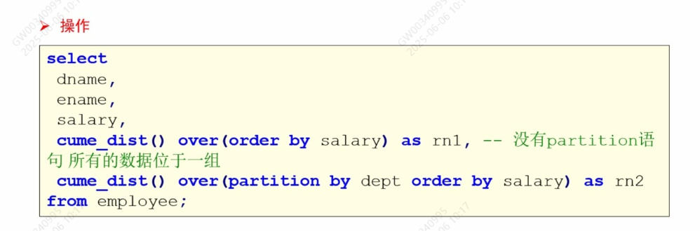 用途:每行按照公式(rank-1)/(rows-1)进行计算,其中,rank为rank()函数产生的序号,rows为当前窗口的记录总行数