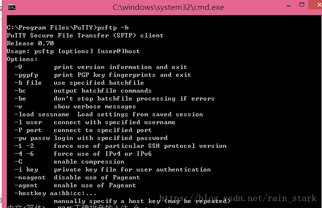 首先,打开putty安装目录,输入psftp -h,查看帮助信息