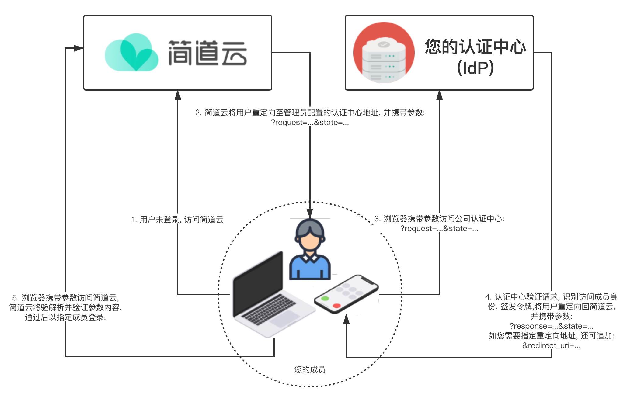 最近需要将内部系统与简道云做对接,在实现单点登录时参考官方文档时比较繁琐,技术支持人员也说的不够清楚,其实就是参考下面这幅图的调用过程,其中第2,3步都是访问的公司内部系统接口,通过这两次的请求来确认用户身份,进行登录验证。