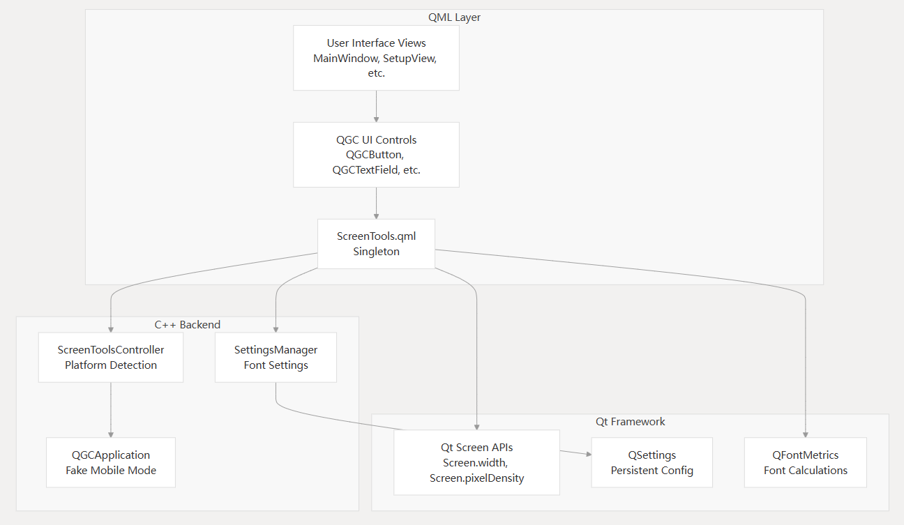 屏幕工具和 UI 指标系统为 QGroundControl 提供了响应式用户界面设计功能,从而能够在不同的平台、屏幕尺寸和设备类型上实现一致的视觉呈现。该系统以ScreenToolsQML 单例为中心,用于计算并提供标准化的字体指标、屏幕测量值以及特定于平台的 UI 参数。