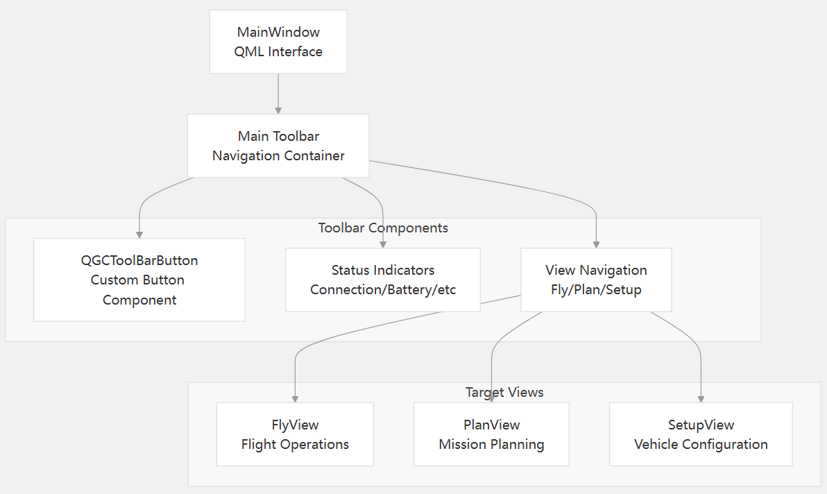 主工具栏是 QGroundControl 中的主要导航界面,允许用户在不同操作模式之间切换并查看应用程序状态。该工具栏使用自定义 QML 组件实现,可提供一致的样式和行为。