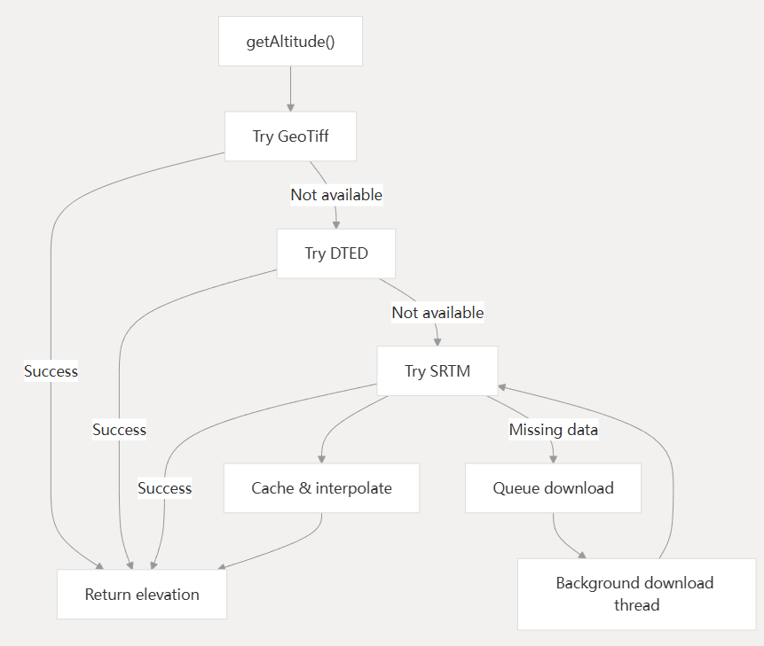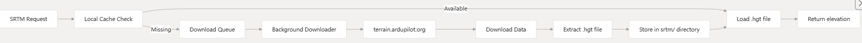 Mission Planner 的地形数据系统提供来自多个来源的数字高程数据访问,并具有回退机制,可在可用时优先使用更高分辨率的数据源。该系统智能地管理数据的下载、缓存和访问,以便为应用程序的其他组件提供高程信息。