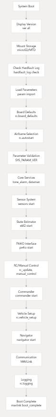 PX4 的启动过程由存储在 ROMFS 中的 Shell 脚本控制,ROMFS 嵌入在飞行控制固件中。系统遵循确定的顺序,初始化硬件、加载参数、启动核心模块,并根据机身类型配置飞行器。