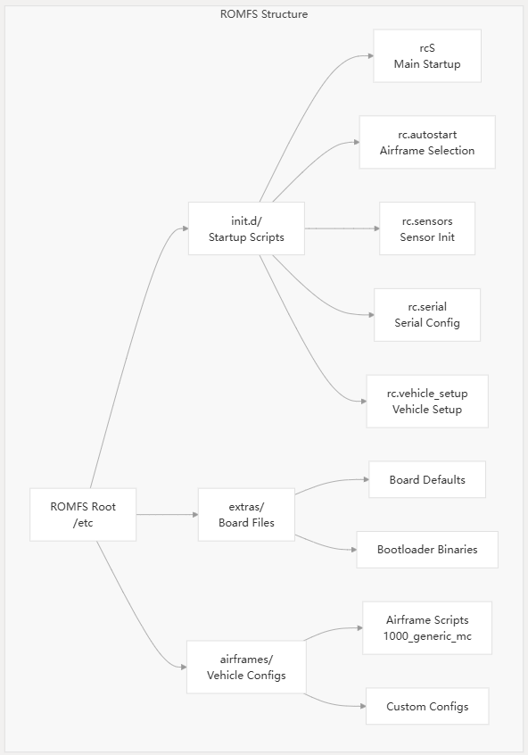 ROMFS 包含所有启动脚本、机身配置和初始化文件。构建系统在编译期间生成此文件系统。