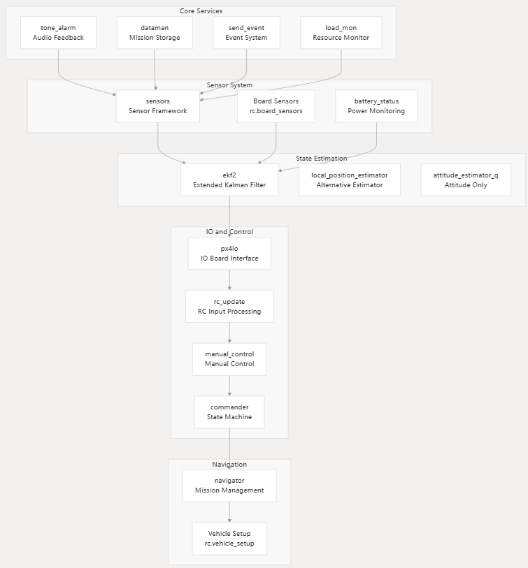 本文档介绍 PX4 系统的启动和初始化过程,包括只读存储器文件系统 (ROMFS) 结构、启动脚本和模块加载顺序。初始化过程将系统从启动状态转变为完全可操作的飞行控制系统。