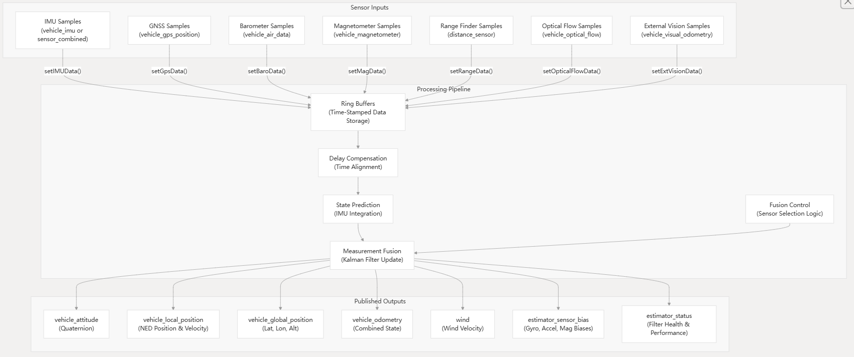 - 输出发布:估计状态发布到 uORB 主题,供其他模块使用