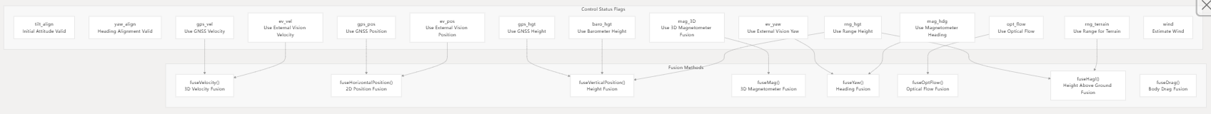 EKF2 模块可以融合来自多个传感器的数据,以提供稳健的状态估计。融合过程由一组标志控制,这些标志决定使用哪些传感器。