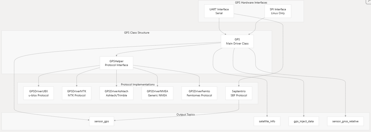 主GPS类管理硬件接口和协议检测,而GPSHelper子类则实现特定的 GPS 协议。该系统支持自动协议检测,并可同时处理多个 GPS 实例。像 Septentrio 这样的专用驱动程序实现了自己的协议处理。