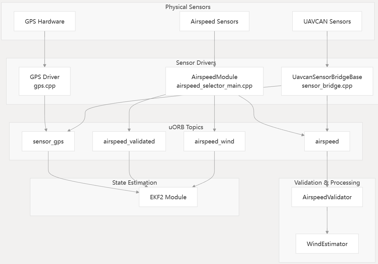 PX4 传感器集成系统遵循模块化架构,其中各个传感器驱动程序将原始传感器数据发布到 uORB 主题,然后由验证模块和状态估计器使用。