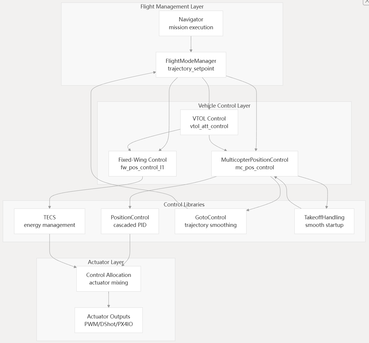 PX4 中的飞行器控制系统由特定于飞行器类型的控制器组成,这些控制器根据飞行器的动力学和执行机制实施不同的控制策略。每种飞行器类型都有各自的控制模块,用于处理从期望轨迹到执行器指令的转换。