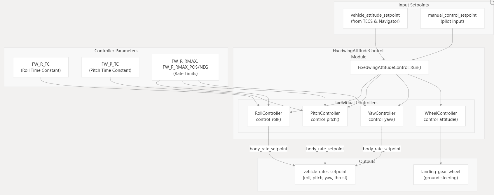 该FixedwingAttitudeControl模块使用单独的单轴控制器将来自 TECS 和导航的姿态设定点转换为身体速率设定点。