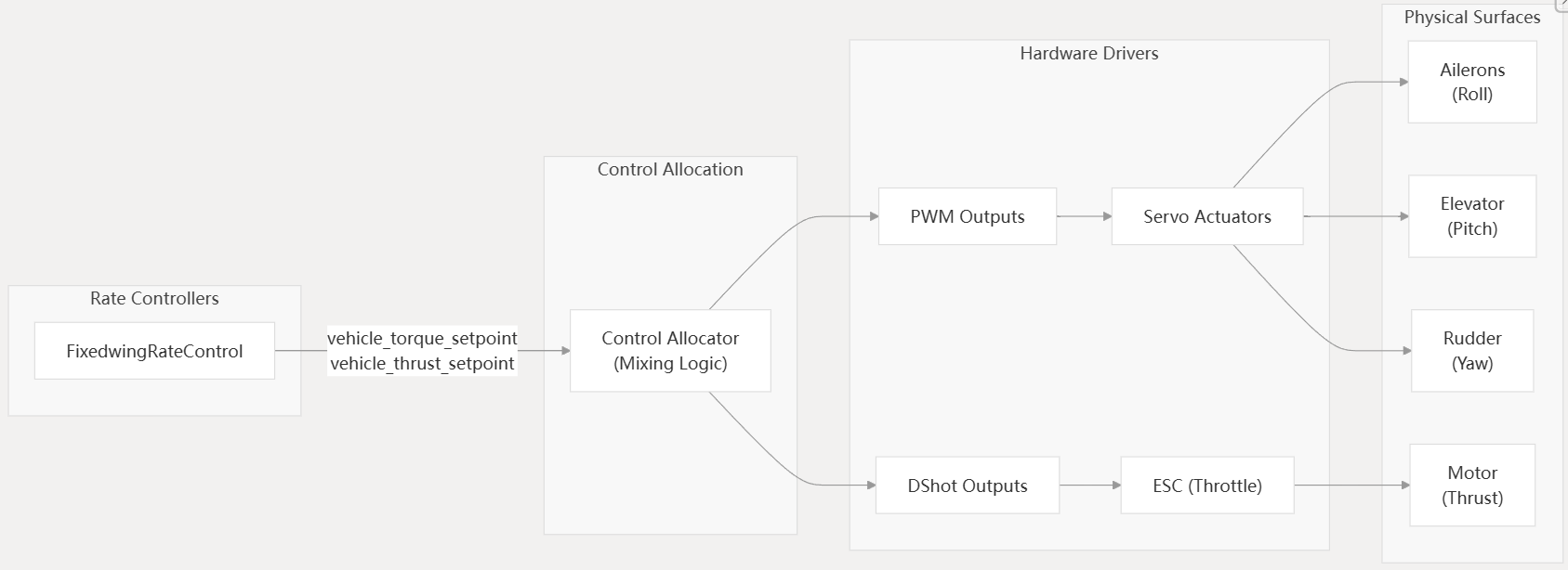 固定翼速率控制输出由控制分配系统处理以驱动物理执行器:
