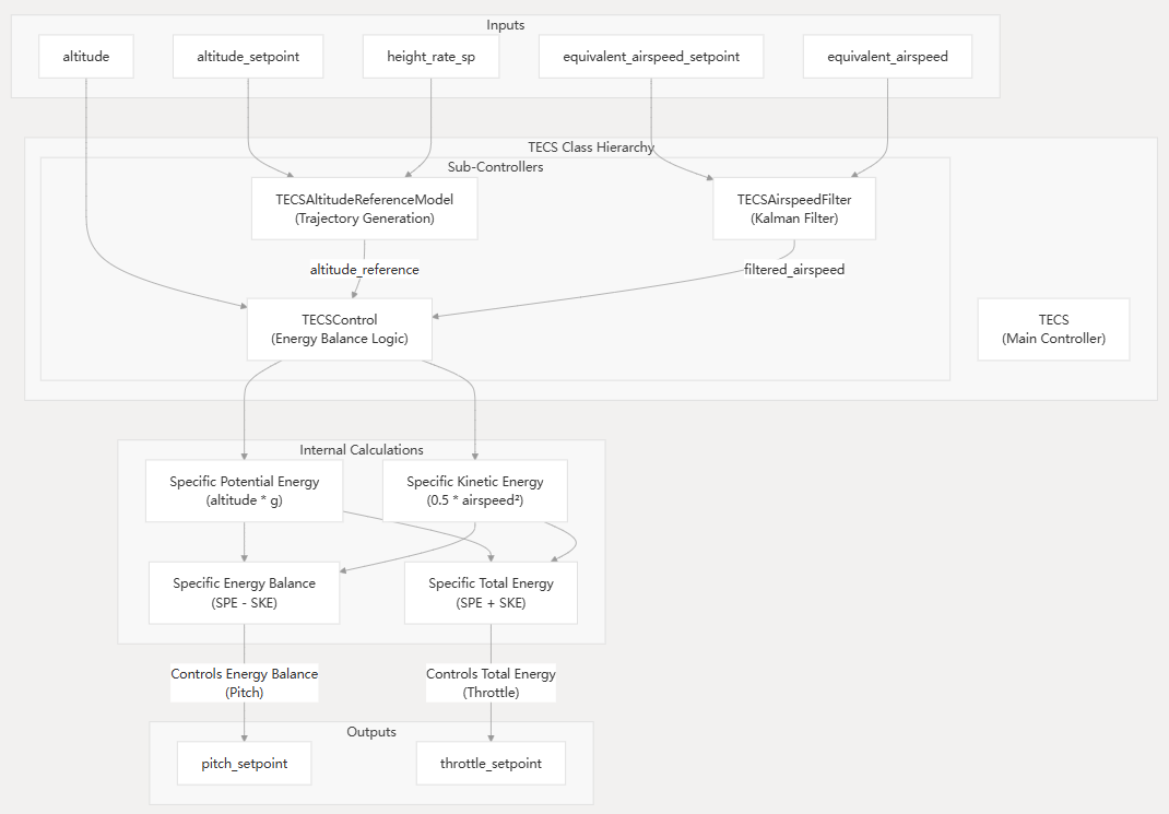总能量控制系统(TECS)是固定翼纵向控制的核心,管理高度(势能)和空速(动能)之间的能量平衡。