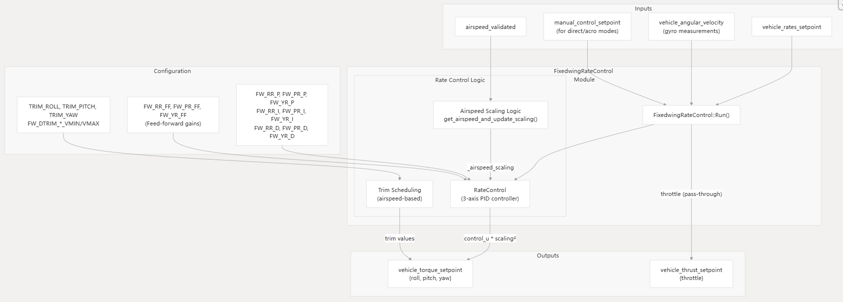 该FixedwingRateControl模块实现最内层的控制回路,将角速率设定点转换为执行器扭矩和推力命令。