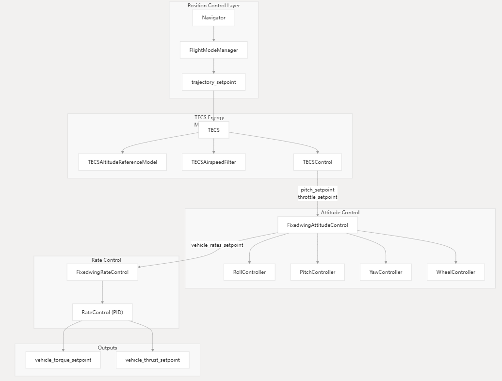 固定翼控制系统采用级联控制架构,最高级别为能量管理,其次是姿态控制,最后是速率控制。
