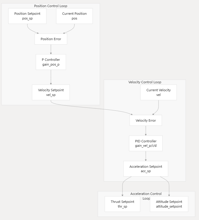 - 加速度控制器:将加速度设定点转换为推力大小和姿态设定点