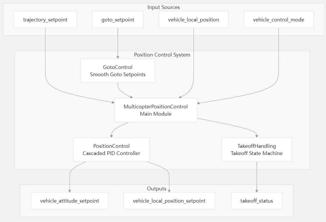 该MulticopterPositionControl模块作为主协调器,按计划工作项以约 100Hz 的频率运行。它集成位置反馈、轨迹设定点和车辆约束,为下级姿态控制器生成姿态指令。