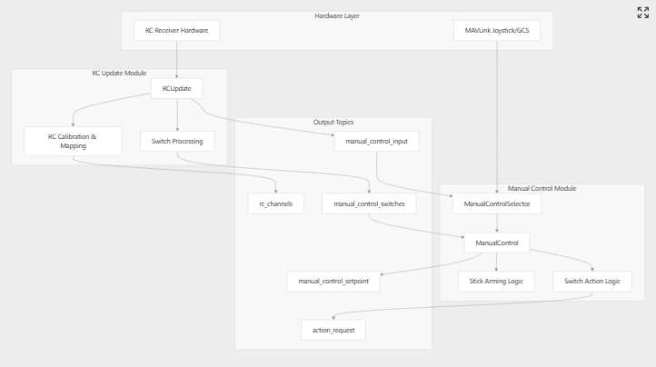 手动控制接口处理无线电遥控器 (RC) 和 MAVLink 操纵杆的输入,生成标准化的手动控制设定点和飞行控制系统的操作请求。该系统负责输入验证、信号源选择、校准、开关处理以及操纵杆解锁手势等安全功能。