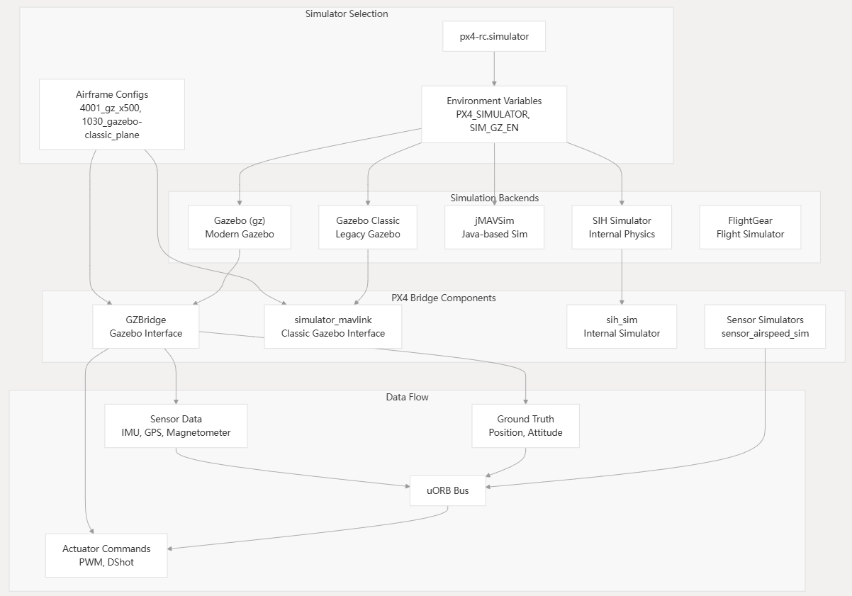 该仿真测试系统为PX4提供软件在环(SITL)仿真功能,无需物理硬件即可开发、测试和验证飞行控制算法。该系统支持多种仿真后端,包括Gazebo、Gazebo Classic、jMAVSim、FlightGear以及内置的硬件仿真(SIH)模拟器。