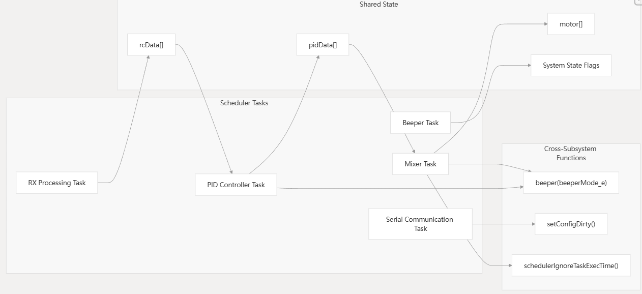 Betaflight 采用协作调度模型,其中子系统通过共享全局状态和函数调用进行通信,而不是通过消息传递。