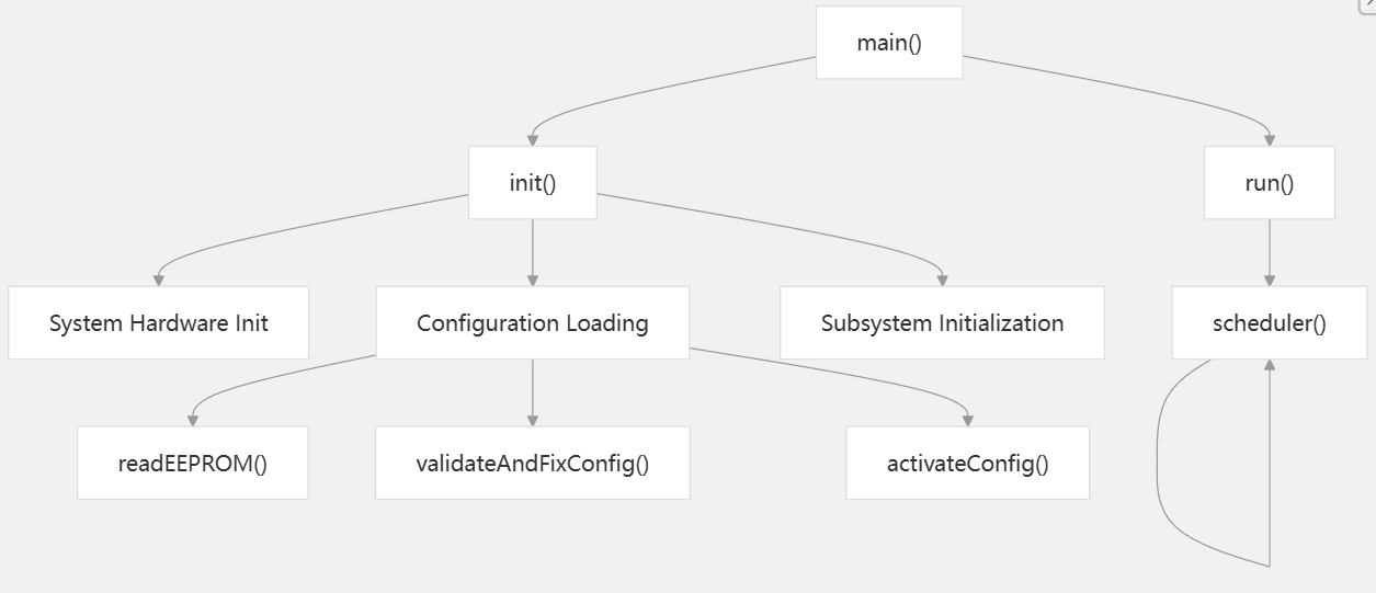 Betaflight固件遵循标准的嵌入式系统模式,先进行初始化,然后进入无限循环的主程序。