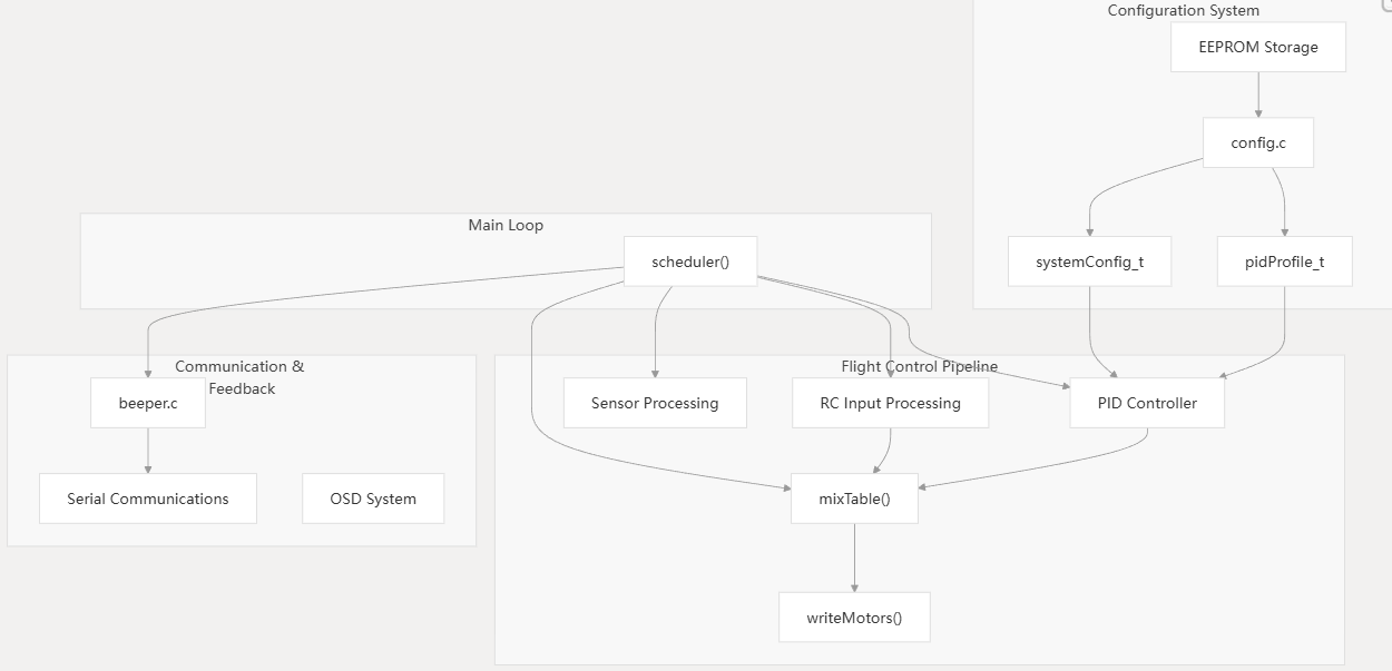 Betaflight 架构由多个相互连接的子系统组成,这些子系统协同工作以提供飞行控制功能。