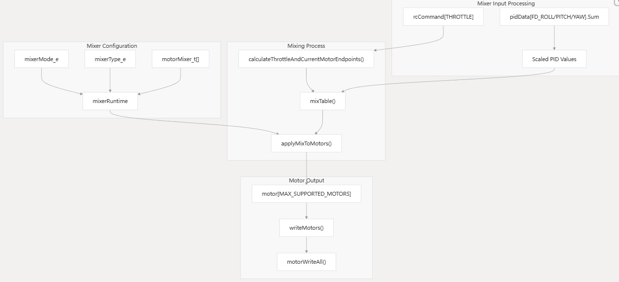 mixerMode_e该混音器通过枚举和不同的混音算法支持各种飞机类型mixerType_e。该mixTable()函数由调度器调用,并协调整个混音过程。