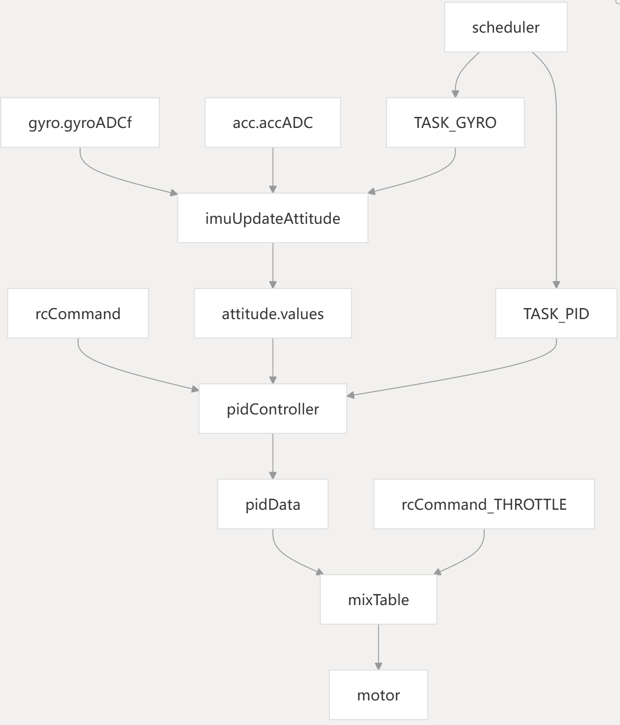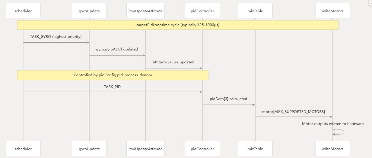 飞行控制系统是Betaflight的核心组件,负责实时飞行控制算法和数据处理。它实现了主控制回路,该回路处理传感器数据、执行控制算法并生成电机指令,以维持飞行器的稳定性和响应性。该系统在严格的实时约束下运行,以确保飞行行为的可预测性。