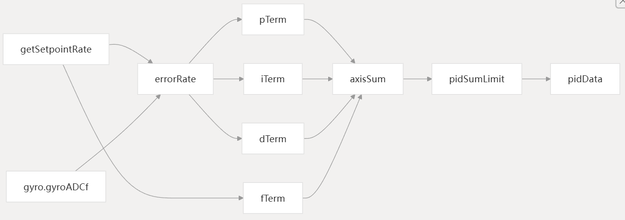 PID控制器(pidController())是核心稳定算法,用于处理姿态误差并生成控制信号。它在三个轴(横滚、俯仰、偏航)上运行,每个轴都有单独的调节参数。