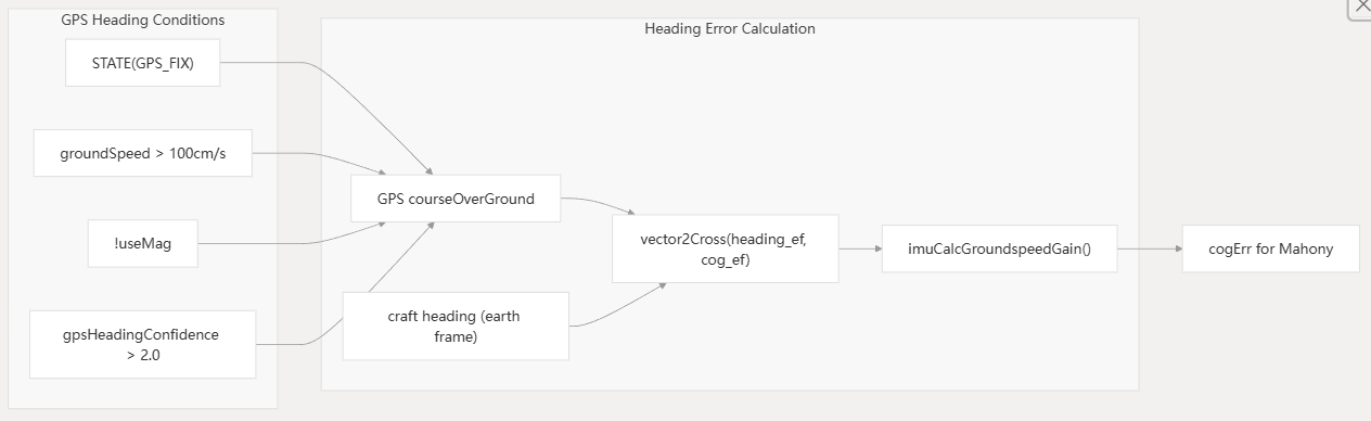 核心姿态估计采用 Mahony 姿态航向参考系统 (AHRS) 算法,该算法融合了陀螺仪速率、加速度计和磁力计/GPS 航向修正:
